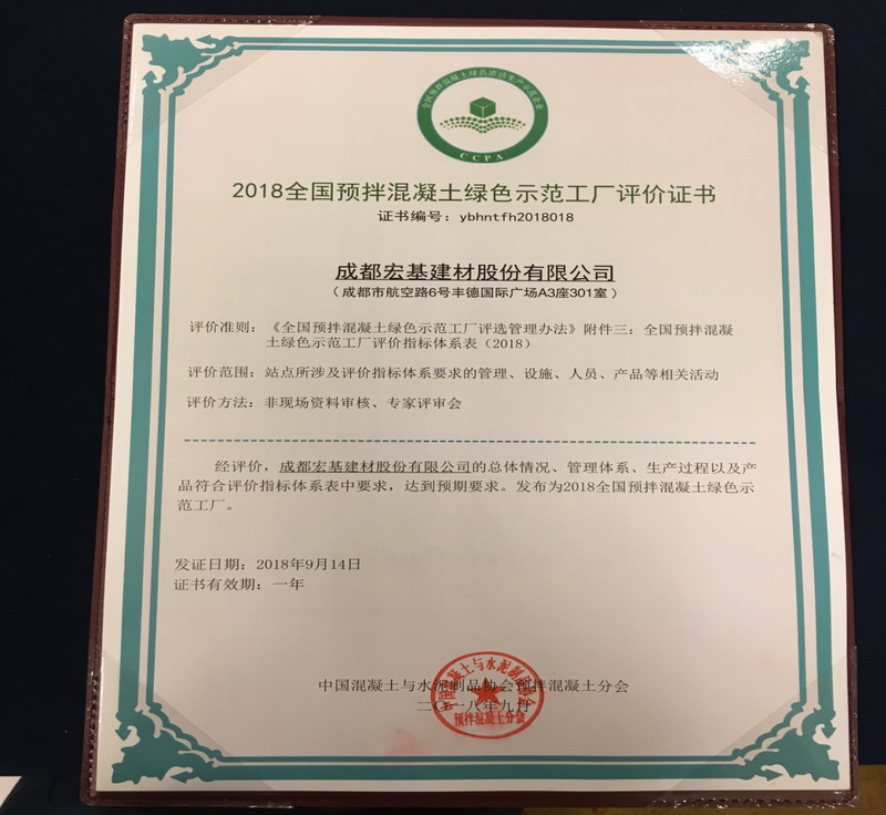 2018年9月13日至15日,由中國(guó)混凝土與水泥制品協(xié)會(huì)預(yù)拌混凝土分會(huì)主辦的“第二屆預(yù)拌混凝土工廠智能制造和裝備設(shè)施綠色環(huán)保升級(jí)高峰論壇”在上海舉行,設(shè)備管理部經(jīng)理肖斌武、技術(shù)質(zhì)量部副經(jīng)理何科文代表公司參加了會(huì)議。本次會(huì)議頒發(fā)了成都宏基建材股份有限公司“2018全國(guó)預(yù)拌混凝土綠色示范工廠”的證書。全國(guó)范圍內(nèi)評(píng)定了51家達(dá)標(biāo)企業(yè)。這是對(duì)公司長(zhǎng)期以來(lái)在綠色、智能、低碳、循環(huán)、可持續(xù)性發(fā)展等方面的肯定。成都宏基將以此為新起點(diǎn),在綠色生產(chǎn)方面繼續(xù)努力,不斷前行,實(shí)現(xiàn)我們“成為基業(yè)長(zhǎng)青的綠色生產(chǎn)商”的企業(yè)愿景,為建設(shè)更美麗更宜居的城市作出自己的貢獻(xiàn)。